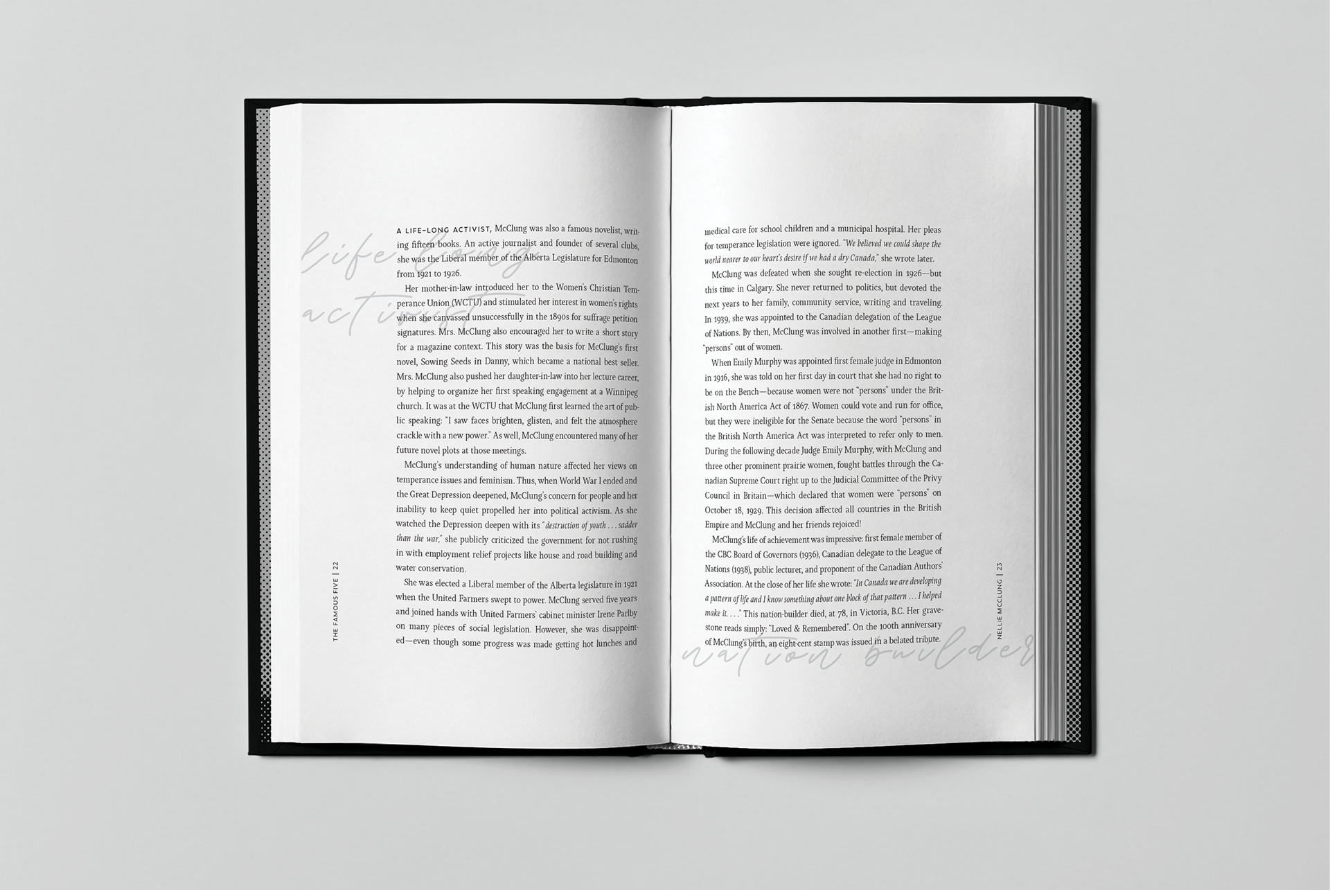 This book features the stories of the Famous Five, a group of extraordinary women who helped secure the vote for women in Alberta. It introduces their story as a collective as well as highlighting their individual contributions. The use of images, quotes, and story give the reader insight into the lives of these amazing women.